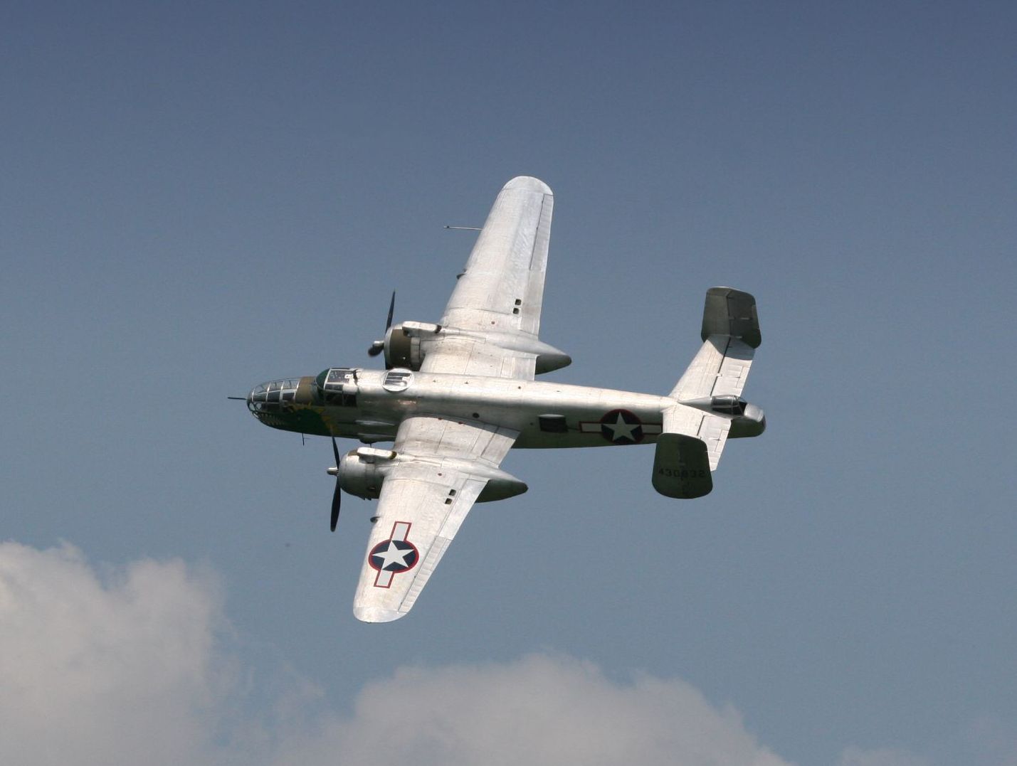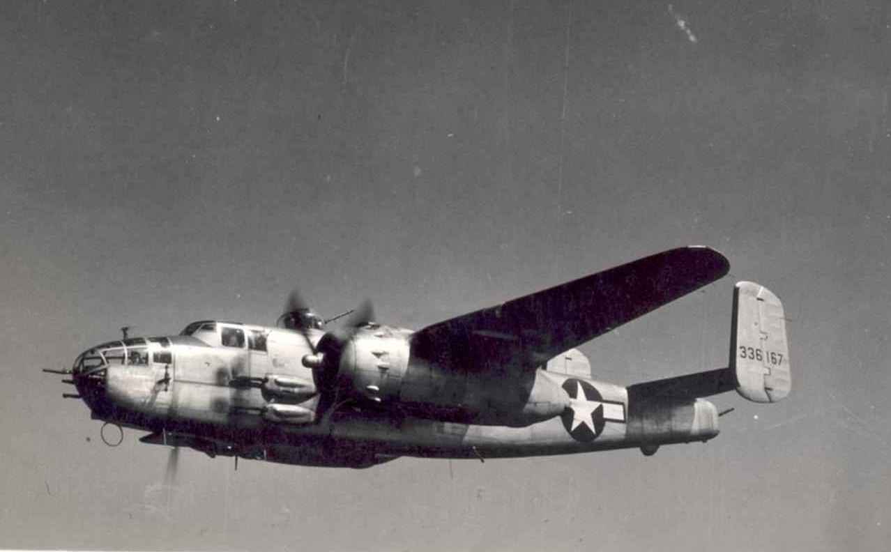 In total, more than 9,800 units were built in 12 basic variants, on the basis of which numerous modifications were created. The most popular was the B-25D version with two Wright R-2600-13 Cyclone air-cooled engines, each with a power of 1,850 hp. The aircraft had a length of 16.13 m, a wingspan of 20.6 m, a maximum take-off weight of 19 t, a maximum speed of 460 km/h, and a practical range of over 2,400 km. The normal bomb load was 1,360 kg, and the maximum was 2,800 kg. Defensive armament consisted of six 12.7 mm machine guns.