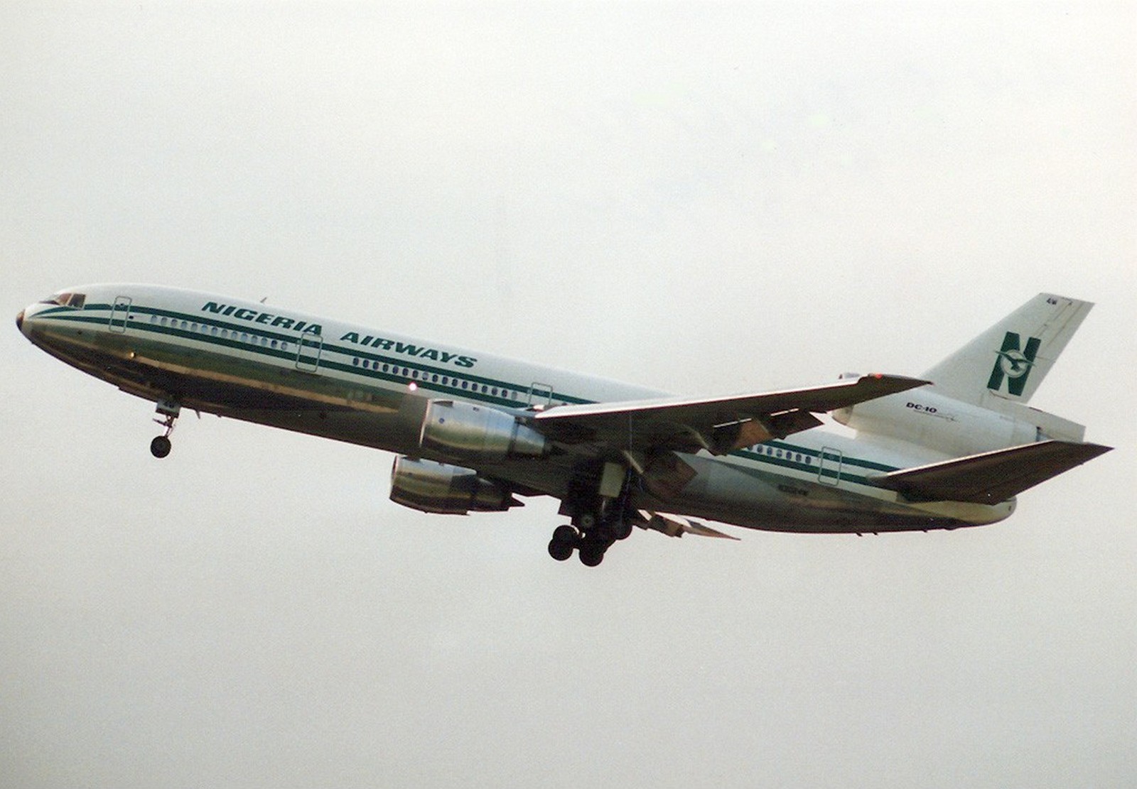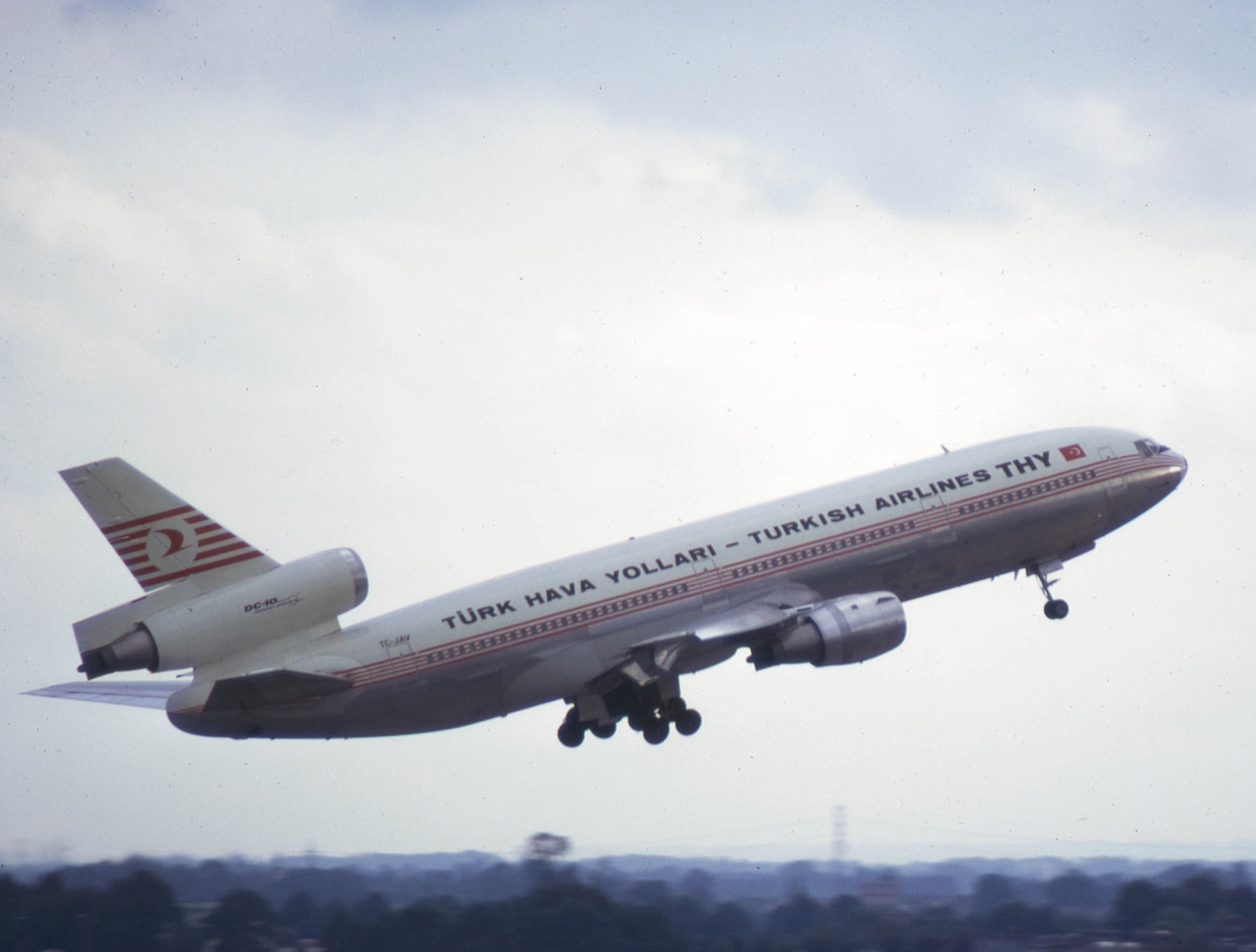 The DC-10-40 long-range airliner was equipped with three Pratt & Whitney JT9D turbofan engines, each with a thrust of 24 tons. It had a length of 55.5 m, a wingspan of 50.4 m, a maximum take-off weight of almost 252 t, a maximum speed of 940 km/h, and a practical range of 9,400 km. The aircraft could carry up to 380 passengers, but a two-class configuration with 270 seats was more common.