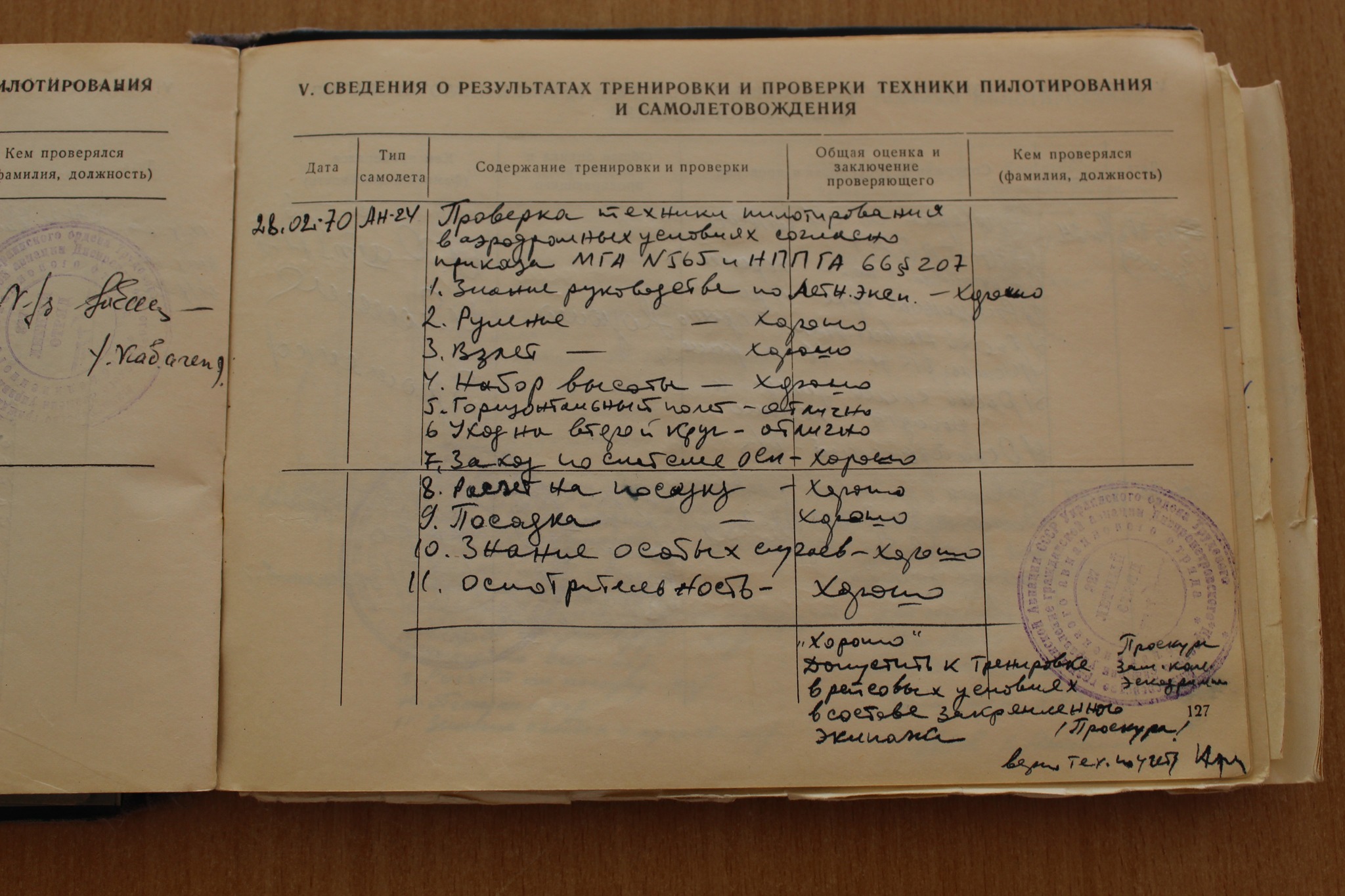 - The flight log of a pilot from the Dnipro Air Squadron. He began his career in 1956 on a Po-2 aircraft, later flew on an An-2, and from 1970 on an An-24;