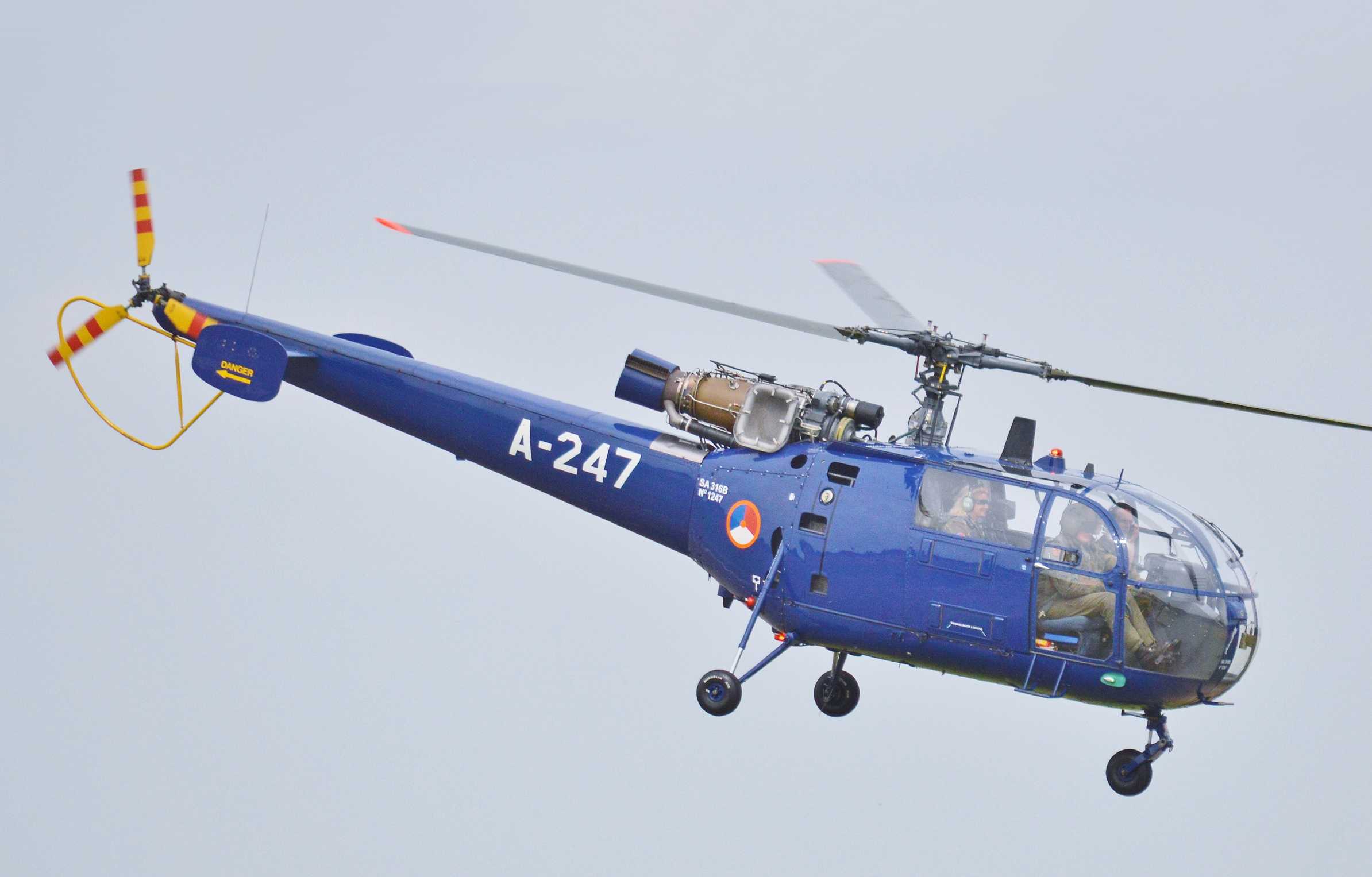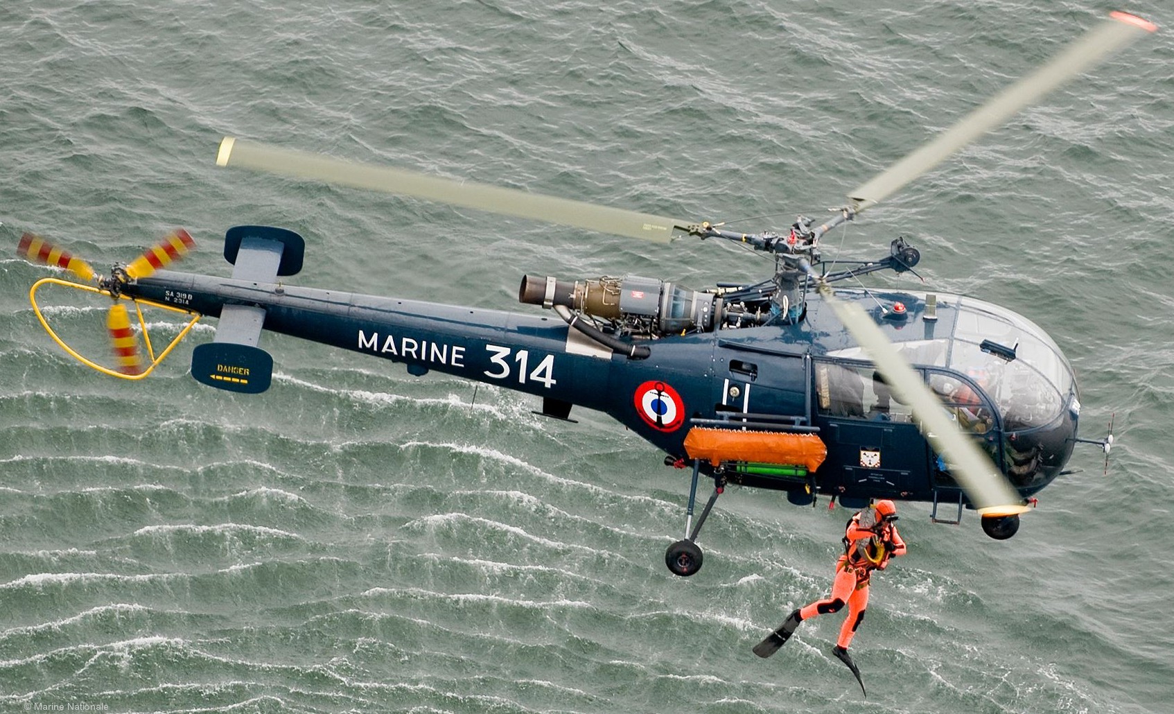 The serial SA 316B variant was powered by a single Turbomeca Artouste IIIB turboshaft engine with 870 hp. It had a length of 12.84 meters, a rotor diameter of 11.02 meters, a maximum takeoff weight of 2200 kg, a payload capacity of 750 kg, a maximum speed of 210 km/h, and a practical range of 540 km. The helicopter could be equipped with armaments, including a 20mm cannon, up to four guided anti-tank missiles, or up to four pods of 68mm unguided rockets. The SA 319B variant was equipped with a Turbomeca Astazou XIVB engine with 590 hp.