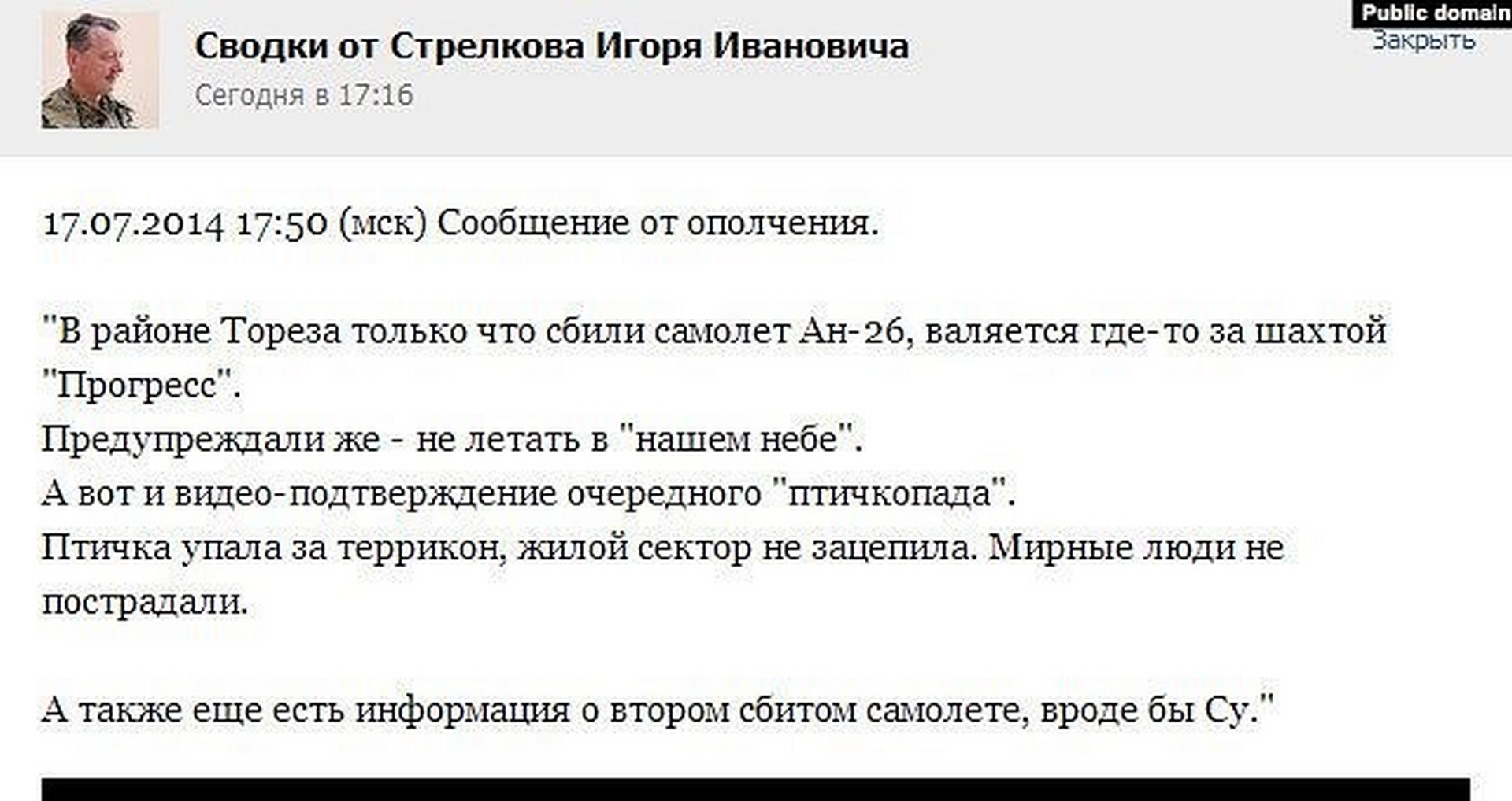 Almost immediately, the so-called "Minister of Defense of the DPR" Igor Girkin posted that a Ukrainian military transport An-26 had been shot down. Shortly thereafter, this news was repeated by the Russian TV channel LifeNews, and other propaganda media picked it up.