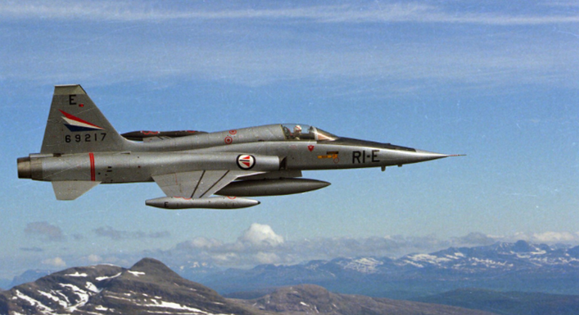 The F-5E fighter was equipped with two General Electric J85-GE-21 engines, each with an afterburning thrust of 2270 kgf. It had a length of 14.58 meters, a wingspan of 8.13 meters, a maximum takeoff weight of 11,214 kg, and could reach a maximum speed of 1,740 km/h. With additional fuel tanks, it could cover over 2,860 km. The aircraft was armed with two 20-mm cannons with a total ammunition load of 560 rounds and could carry up to 3,200 kg of armament on seven external hardpoints, including AIM-9 Sidewinder air-to-air missiles, AGM-65 Maverick air-to-surface missiles, a wide range of bombs, napalm tanks, and rocket pods.